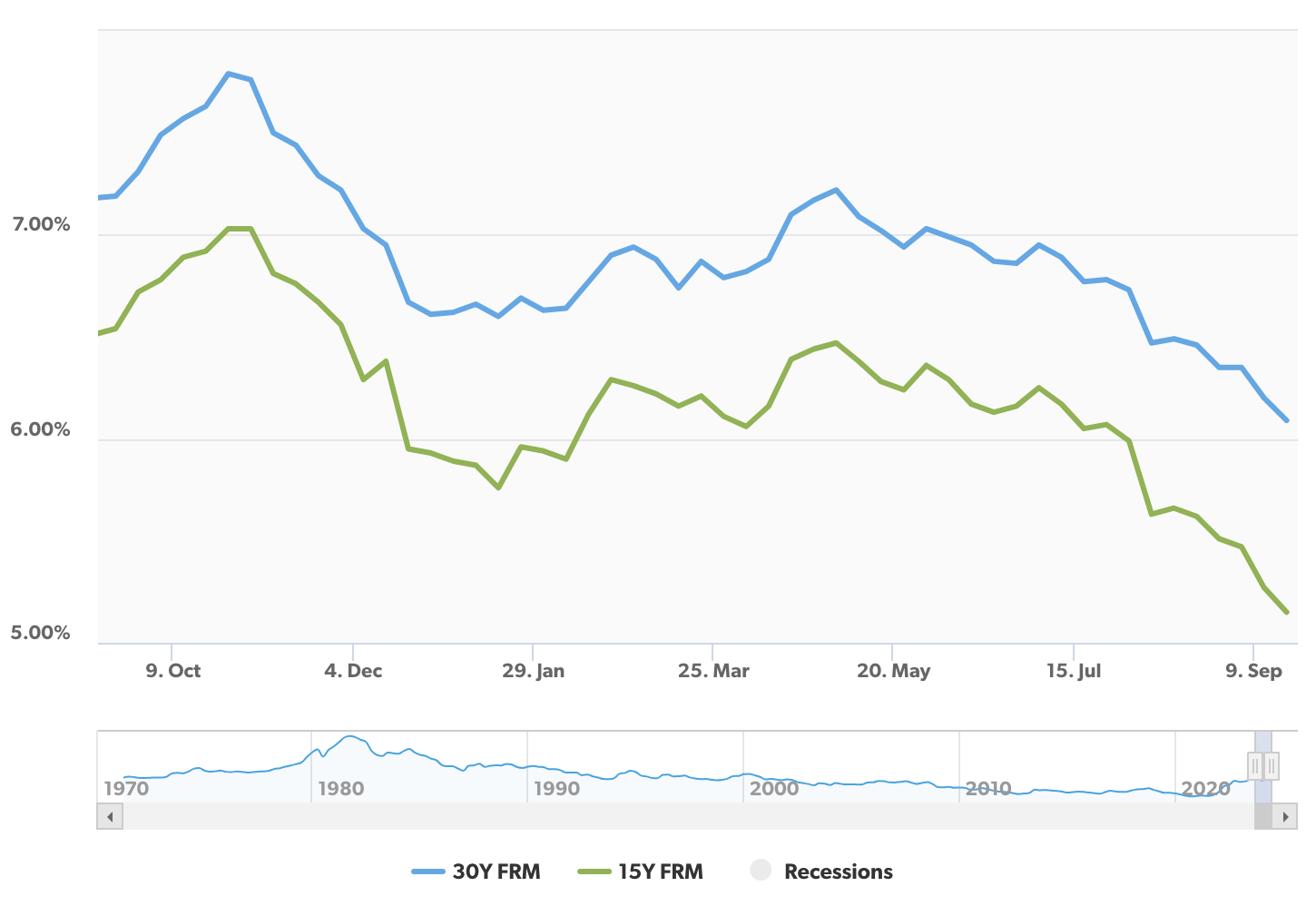 - The average 30-year fixed mortgage rate dropped from 6.2% on September 12 to 6.09% on September 19, 2024. This is a 170 basis point decrease from the October 2023 high of 7.79%
